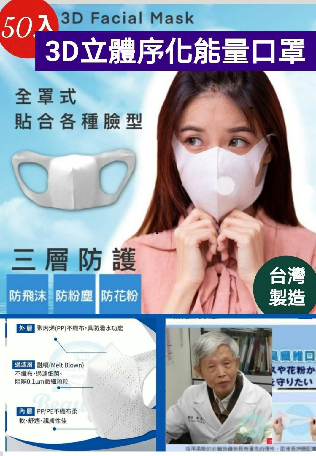 立体序化能量口罩 50入 不织布 三层防护